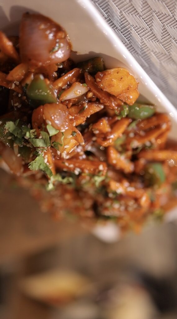 A deliciously spicy stir-fried dish tossed in a rich, glossy sauce with crunchy vegetables and aromatic herbs.