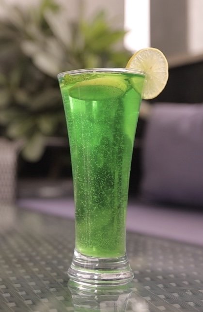 A vibrant green mocktail served chilled in a tall glass, garnished with a fresh slice of lemon. Light, fizzy, and refreshingly cool—perfect for a relaxing break or a sunny day treat
