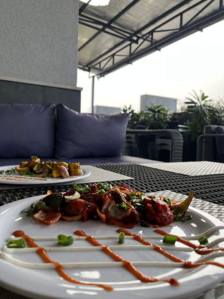 A beautifully plated spicy starter served in a rooftop setting, drizzled with flavorful sauces and topped with fresh herbs